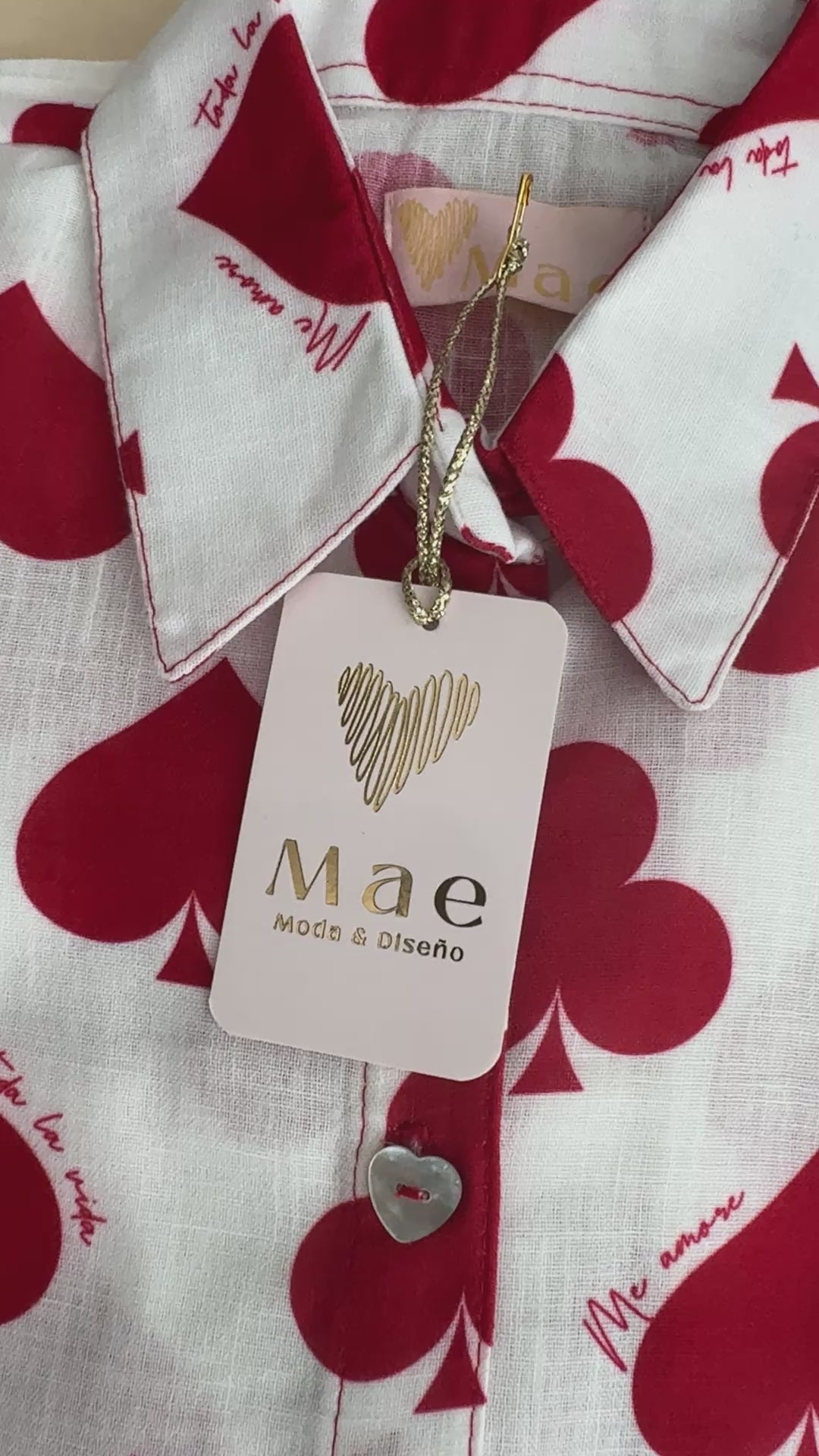 Confeccionada en tela Leblon, un material con una textura y caída muy similar al lino, esta camisa te ofrece frescura y comodidad sin comprometer el estilo. Su tacto es suave y agradable, ideal para llevarla en climas cálidos o para crear un look relajado pero sofisticado. El estampado propio de la marca es el corazón de la prenda,  junto con el detalles clave como los botones de nácar en forma de corazón.